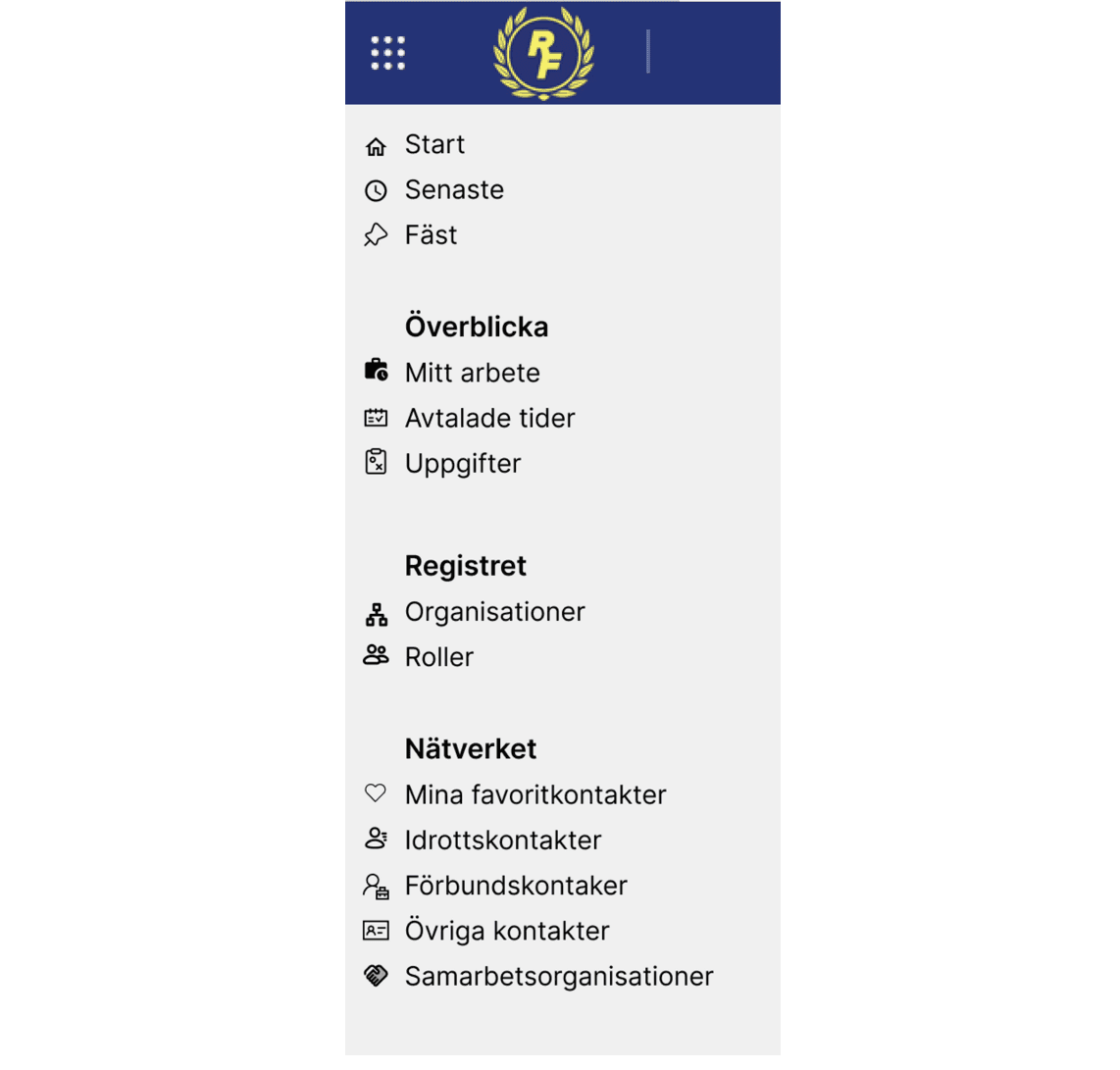 Det du ser här är ett förslag på hur menyvalen kan komma att se ut i första versionen av Idrottsarenan. Du kan hjälpa oss förstå hur bra dessa menyval förmedlar det tänkta innehållet.